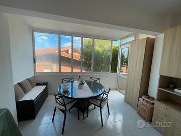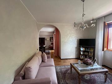 All'interno di piccola palazzina in buone condizioni, appartamento al piano terra, composto da: ingresso, soggiorno, sala, cucina, 2 camere e 2 bagni. Terrazzo verandato e giardino. Garage doppio.