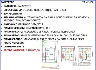 Agenzia G.G. Consulting Immobiliare, propone In vendita, una nuova costruzione di un fabbricato , situato in posizione privilegiata, in parete alla via della Repubblica, ideale per uso residenziale e commerciale.e sono così composti: Piano rialzato: Locale commerciale di circa 75 mq, con ampie vetrine, perfetto per attività professionali o negozi, dotato di un cortile privato di circa 90 mq, che offre spazio aggiuntivo per esposizione, parcheggi o area esterna. Primo piano: Appartamento di circa 75 mq, con terrazza di circa 30 mq, ideale per pranzi all'aperto, momenti di relax o per godere della vista panoramica. Secondo piano: Mansarda di circa 75 mq con 30 mq di balconi, una soluzione perfetta per creare un ambiente unico e accogliente, ricca di luce naturale e con un design moderno. L'immobile è dotato di impianto di riscaldamento con radiatori e predisposizione per condizionatori, garantendo il massimo comfort in ogni stagione. La costruzione, di alta qualità, permette di sfruttare al meglio ogni spazio. Prezzo intero del fabbricato euro 450.000 N.B. SOLO PERSONE INTERESSATI.NO PERDITEMPO. Per info chiamare al Ggconsulting2020@libero.it