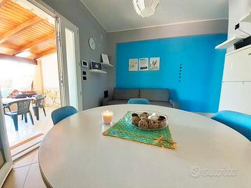 Al piano terra di una villetta plurifamiliare, si presenta accogliente e luminosa . Dai colori mediterranei del turchese e del bianco, è dotata di ogni confort per soggiorni piacevoli e rilassanti . E' composta da due camere da letto (di cui una con cabina armadio), cucina/soggiorno con divano letto, bagno, ripostiglio e ampio terrazzo attrezzato, dove è possibile cenare e godere del fresco della sera. Dotata di serrande motorizzate, zanzariere alle finestre e aria condizionata/riscaldamento, potrete usufruirne durante qualsiasi periodo dell'anno!
