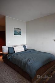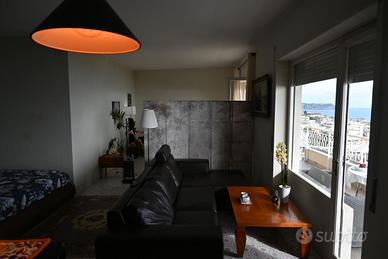 Un ingresso discreto apre su un open space luminoso: il letto matrimoniale con vista mare, un salottino intimo pensato per accogliere, una cucina ad isola in stile americano.