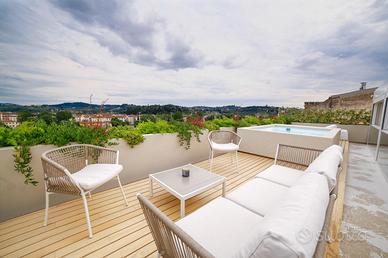 FIRENZE LUNGARNO COLOMBO In contesto elegante ed ottimamente ubicato, ad un passo dal centro storico, proponiamo in vendita prestigioso appartamento di oltre 100 mq posto al piano terra rialzato. L'immobile, frutto di una recentissima ristrutturazione, viene venduto arredato, con alte finiture di lusso e design, ed è così composto: ampia zona living e cucina open space, due camere matrimoniali (di cui una con bagno en suite), cameretta ed ampio guardaroba. Di pertinenza all'appartamento inoltre abbiamo uno splendido rooftop di circa 90 mq, posto al 6° piano servito da ascensore, con splendida vista sullo skyline cittadino. L'attico è dotato di un ampio pergolato, vasca idromassaggio e solarium. Tutti i materiali utilizzati, tra cui rivestimenti in resina e pannelli in legno di rovere, rendono l'immobile unico nel suo genere. Riferimento: C11-083 C.E.: C IPE: 100.00 kWh/mq