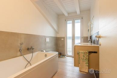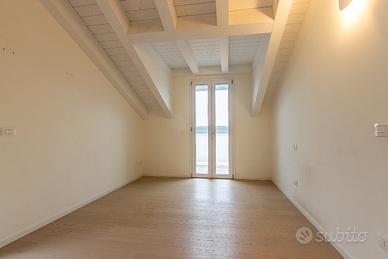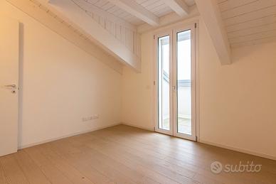Sviluppato al secondo ed ultimo piano e dotato di ascensore, l'immobile si compone di ingresso, soggiorno con cucina separabile, dotato di un ampia vetrata scorrevole con accesso ad un terrazzo abitabile di 33 mq; a completare il piano un bagno finestrato, un ripostiglio ed camera matrimoniale. Salendo le scale troviamo la zona notte completamente travata a vista, composta da altre 3 camere da letto ed un bagno finestrato. A completare al piano seminterrato troviamo un garage doppio in larghezza.