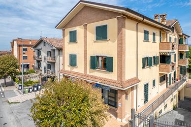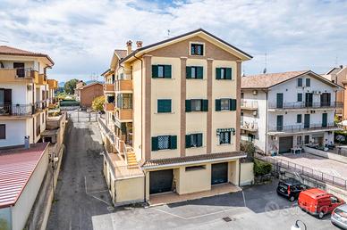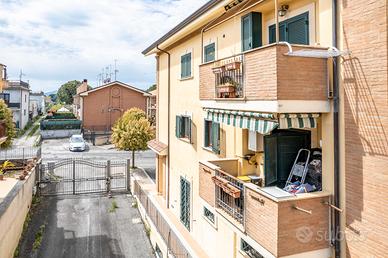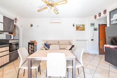 La disposizione interna prevede un ingresso, salone con camino e cucina a vista e con porta finestra con uscita sul terrazzino, una camera matrimoniale, una cameretta ed un bagno finestrato con box doccia. Completa la proprietà una cantina di circa 5mq al piano seminterrato raggiungibile tramite ascensore ed un posto auto assegnato all'interno dell'area condominiale con accesso tramite cancello automatico.