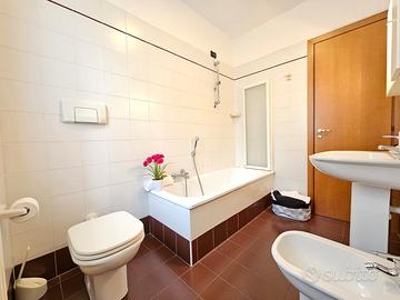 Due camere da letto spaziose e bagno finestrato con vasca-doccia, sanitari, lavabo e lavatrice.