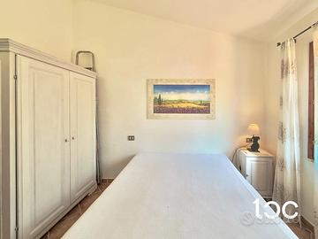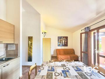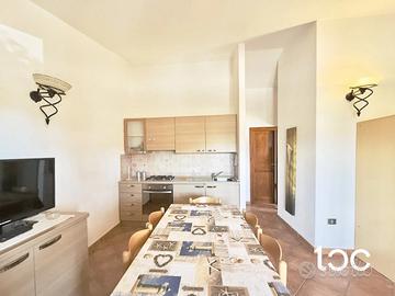 L'immobile si apre su un accogliente soggiorno con angolo cottura, una veranda coperta , luminosa e rifinita con eleganti travi a vista in legno, ideale per rilassarsi godendo di una piacevole vista. La zona notte è composta da una camera matrimoniale, una camera doppia e un bagno.