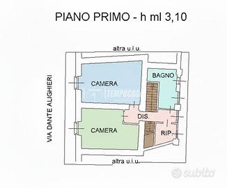 PIANO PRIMO: PRIMA CAMERA di 17 mq, SECONDA CAMERA di 11 mq, BAGNO PADRONALE con VASCA e RIPOSTIGLIO.