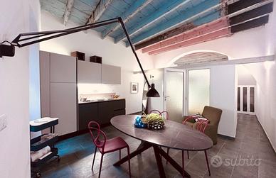 In the historical heart of one of the most beautiful villages in Italy, for sale (directly by the owner) bright loft studio apartment completely renovated in 2024 , furnished with designer pieces, vintage objects and original choices of colours and materials. 75m2, ground floor, accessible: double bathroom, entrance with sofa bed and relaxation area, double bedroom , brand new kitchen with appliances, dinner area, and a cozy private courtyard with kitchenette (double exposure).