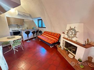 Ingresso su cucina/soggiorno, soppalco con due letti singoli, ripostiglio, camera da letto, bagno con doccia e cortile.