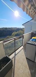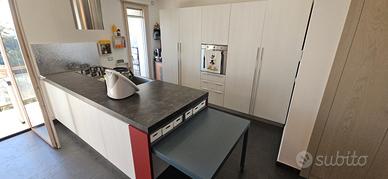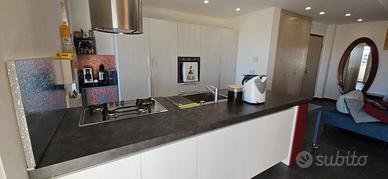 L'ingresso si apre su un raffinato open space soggiorno-cucina con accesso al balcone principale dotato di tende da sole automatiche con sensore antivento.