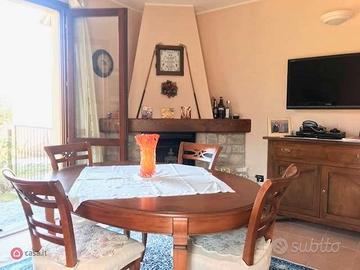 GIARDINO : tettoia in legno e tegole - porticato in legno e glicine fiorito, tavolo marmo intarsiato c/ 6 sedie ferro battuto, prato inglese, secondo tavolo in resina con 6 sedie, 2 lettini in resina, 2 sdraio e ombrellone, impianto d'irrigazione, fontana in pietra e tavolo in pietra, piantumato c/siepe sempreverde, panorama su bosco e tramonto montagne, marciapiede piastrellato c/beole.