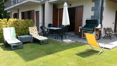 GIARDINO : tettoia in legno e tegole - porticato in legno e glicine fiorito, tavolo marmo intarsiato c/ 6 sedie ferro battuto, prato inglese, secondo tavolo in resina con 6 sedie, 2 lettini in resina, 2 sdraio e ombrellone, impianto d'irrigazione, fontana in pietra e tavolo in pietra, piantumato c/siepe sempreverde, panorama su bosco e tramonto montagne, marciapiede piastrellato c/beole.