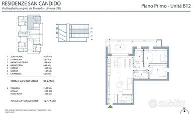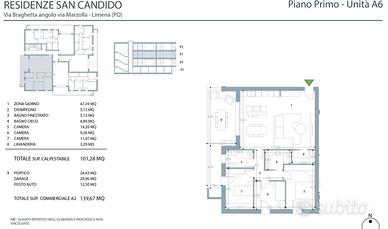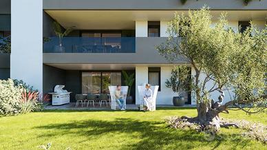 -Appartamento 2 camere con giardino privato: Ingresso, zona giorno open space di circa 45 mq, 2 bagni, rip/lavanderia, due camere. L'unità è dotata di un giardino privato di circa 230, un garage singolo ed un posto auto esterno.