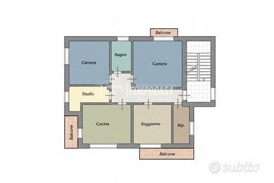 ingresso, soggiorno con accesso al balcone, cucina abitabile con accesso sul balcone, due camere da letto, di cui una con accesso al balcone, studio, ripostiglio e bagno finestrato.