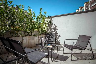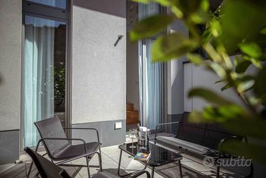 All'esterno, un salottino circondato da piante garantisce privacy e tranquillità, offrendo lo spazio ideale per rilassarsi, chiacchierare o godersi una pausa all'aria aperta.