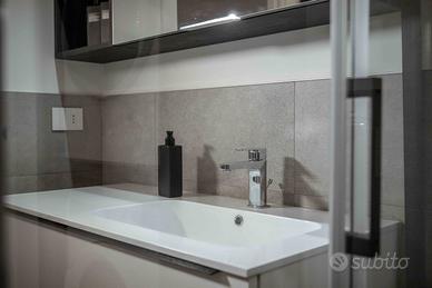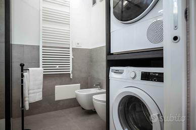 Il bagno, funzionale e raffinato, include lavatrice, asciugatrice, wc, bidet, doccia e lavandino con specchio. Ogni elemento è pensato per offrire praticità e comfort durante l'intero soggiorno. Viene fornito un set completo di asciugamani