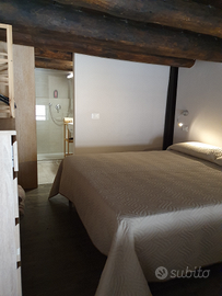 Zona notte: letto matrimoniale, cassettiera, armadio aperto e bagno con box doccia in vetro.