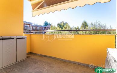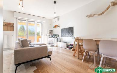 Superato l'ingresso, troviamo il luminoso soggiorno con cucina a vista e il primo balcone esposto ad Ovest con affaccio sul verde circostante.