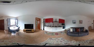 La casa si apre su un luminoso soggiorno con angolo cottura moderno, completo di elettrodomestici nuovi e pensili contemporanei rosso laccato. La zona giorno è confortevole e ben organizzata, con spazio dedicato ai pasti e al relax, grazie al tavolo conviviale, al mobile TV con flat screen e all'ampio divano.