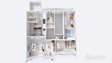 L'appartamento presenta una luminosa zona giorno con angolo cottura a vista e con sfogo tramite porta finestra sulla prima balconata della casa. Dal disimpegno, raggiungiamo le tre camere da letto, tutte matrimoniali, di cui una con bagno padronale e il bagno principale dotato di ampio piatto doccia.
