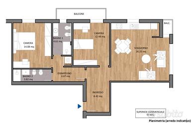 L'immobile è composto da soggiorno con cucina a vista, ampio e accogliente, camera matrimoniale, camera singola, due bagni, comoda nicchia lavanderia e 2 balconi.