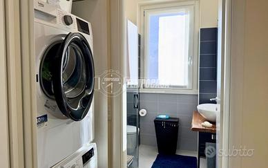 Un primo disimpegno, organizzato con pratica zona lavanderia a colonna, conduce al bagno finestrato con box doccia.