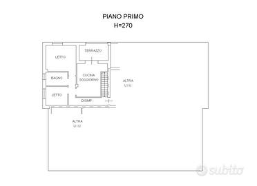 Proseguendo al Primo Piano invece, un disimpegno conduce a un soggiorno con angolo cottura e accesso diretto al terrazzo, un bagno completo e due camere da letto di cui una matrimoniale e una singola.