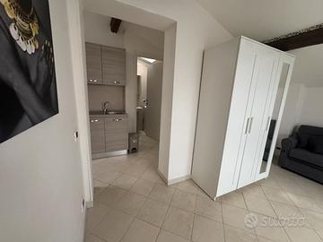 In bellissimo contesto condominiale in centro zona residenziale, proponiamo al secondo ed ultimo piano senza ascensore di piccolo condominio con basse spese condominiali mansarda ad uso investimento così composta: ingresso in cucinotto, stanza da pranzo, camera matrimoniale e bagno tutto arredato con mobili nuovi. Lucernari. Ottimo per investimento condizionatori.