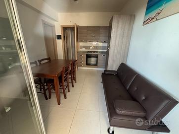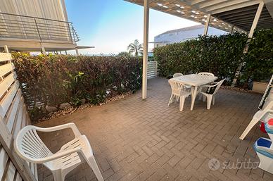 Appartamento in residence, trilocale, una stanza matrimoniale, una stanzetta con letto a castello, un soggiorno ampio con angolo cucina, una spaziosa veranda riparata e con vista sul mare.