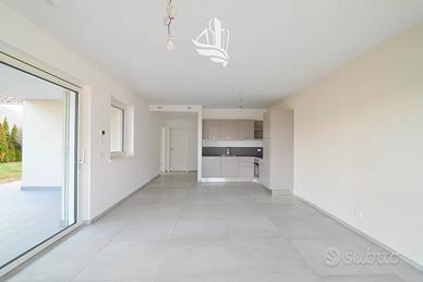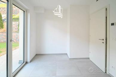 L'appartamento offre una disposizione ben studiata, composta da un accogliente ingresso, un ampio soggiorno con cucina a vista e accesso alla soleggiata terrazza esposta a sud-ovest, due comode camere da letto, un moderno bagno e un pratico corridoio. Il giardino adiacente, facilmente accessibile, garantisce ulteriore spazio all'aperto e totale privacy.