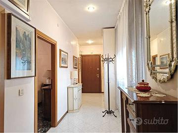 Mestre, Via Passo Falzarego (laterale di Via San Donà), vendesi appartamento al 3° ed ultimo piano (senza ascensore) di un tranquillo e decoroso condominio di sole 8 unità. L'appartamento di 80 mq calpestabili, ha come vero punto di forza uan zona esterna di ben 30 mq funzionalmente suddivisa tra una ampia zona verandata utilizzata come estensione della zona giorno e fruibile tutto l'anno, ed una terrazza aperta ideale per momenti conviviali estivi o come angolo verde. L'appartamento è composto da ingresso, soggiorno, cucinotto, bagno, ampia camera matrimoniale ed una seconda stanza attualmente arredata a salotto ma tranquillamente utilizzabile come seconda camera matrimoniale.