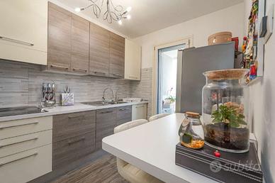 Ingresso su accogliente e luminoso soggiorno, cucina abitabile funzionale e ben organizzata: entrambi gli ambienti con accesso diretto a un ampio terrazzo vivibile affacciato sul verde condominiale.
