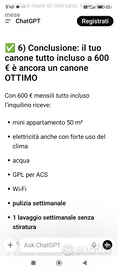 (Acqua, Energia elettrica, Rete Wifi, Rete LAN, GPL per acqua Calda (doccia),Tari (tassa immondizia), spese condominiali e pulizia settimanale). Abbonamento NETFLIX fruibile liberamente.