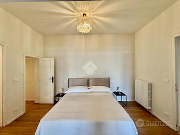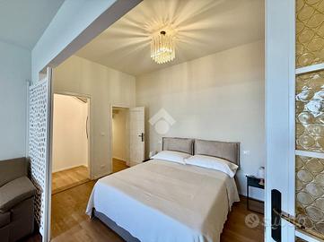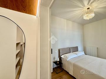La zona notte è a vista con letto matrimoniale, cabina armadio che funge anche a spogliatoio su misura.