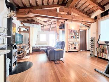 L'appartamento si trova al primo e ultimo piano della palazzina e ci accoglie in una zona giorno molto funzionale e ben organizzata con cucina a vista e angolo pranzo/studio. Alla sua destra si apre la zona notte, corredata da un'ampia armadiatura a muro e potenzialmente divisibile creando un cartongesso. Le travi a vista e il parquet dei pavimenti impreziosiscono questo ambiente che colpisce per la sua luminosità grazie a diversi punti luce.