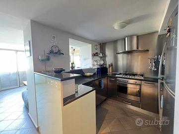 La cucina in stile industriale, completamente attrezzata e inclusa nella vendita, si integra armoniosamente con la zona giorno, valorizzando il carattere contemporaneo della casa.