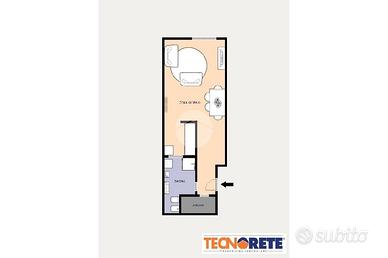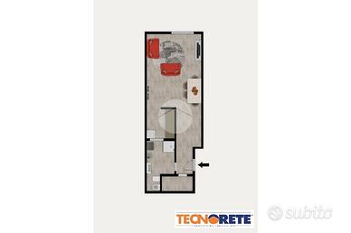 La soluzione si distingue per gli spazi ben distribuiti, con ingresso su un'ampia e luminosa zona giorno, cucina a vista e zona living ben separata. Il bagno è finestrato e dotato di box doccia.