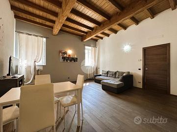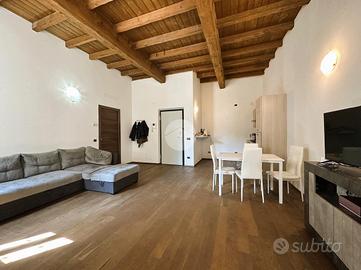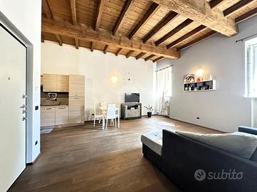 Corbetta: nel cuore del centro storico della Città, in contesto di corte del 1500, protetto dal Ministero dei Beni Culturali, impreziosito da antichi affreschi e caratterizzato da elementi architettonici quali zoccolature in pietra di Luserna e coperture in coppi antichizzati, che riportano all'origine dell'epoca cinquecentesca dell'esterno degli edifici e restituiscono all'intera comunità cittadina un angolo storico e artistico di pregevole interesse. Appartamento distribuito su unico livello, senza alcuna barriera architettonica, con soleggiata esposizione a sud. All'ingresso, tramite portoncino blindato con serratura tipo europea, notiamo subito l'eleganza del soffitto, ripreso in tutta la casa, rifinito con caratteristiche travi a vista in legno e sabbiate. L'appartamento si compone di un ampio locale open-space giorno/notte con relativo angolo cottura; le dimensioni consentono di posizione tranquillamente sia l'arredamento tipico della zona giorno, sia sfruttarlo con arredi come divano letto o mobili con letto incorporato. L'ampio disimpegno ci permette di poter adattare un comodo armadio senza occupare spazio nella zona living/notte. Il bagno è competo di tutti i sanitari ed accessoriato da doccia. Gli Infissi della casa sono in legno con doppi vetri e caratteristici e storici scuri interni, oltre alla predisposizione dell'impianto d'aria condizionata. Il riscaldamento è gestito da caldaia condominiale, con termostato privato, il tutto con la presenza di caratteristici termosifoni in ghisa che, grazie all'ottimizzazione dei consumi e delle calorie, cotribuiscono a contenere i consumi. Completa la soluzione un box autorimessa posto al piano interrato e, di conseguenza, coperto.