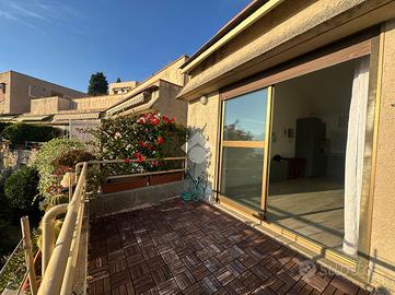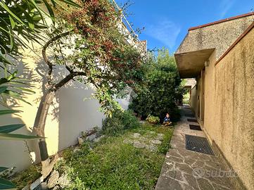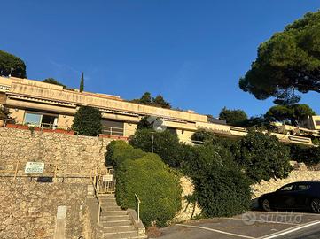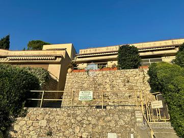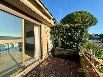 La grande portafinestra conduce al terrazzo vivibile, da cui si gode una vista aperta sul verde e sul mare ideale per rilassarsi o pranzare all'aperto. Completa la proprietà un giardino frontale privato, situato di fronte all'ingresso dell'abitazione.