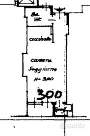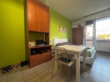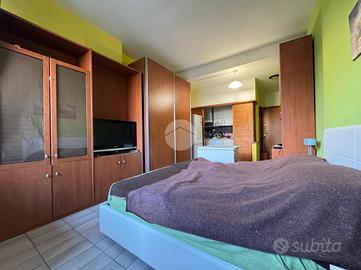 Monolocale al primo piano con ascensore, unico ambiente con cucinotto, ripostiglio, bagno finestrato con box doccia e balcone.