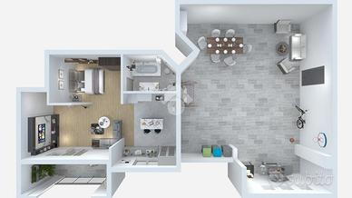 Possibilità di creare una parete scorrevole che permette di separare la zona notte creando una vera camera da letto da cui si accede anche al bagno con vasca/doccia e finestra.