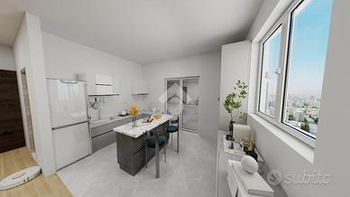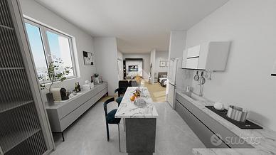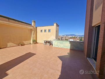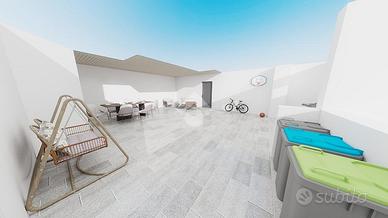 Varcando la soglia entriamo nell'ambiente unico reso molto luminoso dalla presenza di 3 punti luce. In particolare una uscita sul un balcone di 8 mq, molto comodo come balcone di servizio (caldaia, lavatrice e armadiature), una finestra di fronte all'angolo cottura e soprattutto di una uscita sul punto forte della soluzione ossia il terrazzo di 70 mq.