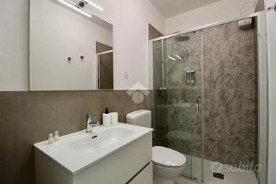 Accedendovi mediante un nuovo portoncino ligneo, ci troviamo nel disimpegno di ingresso dove, sulla sinistra, vediamo il bagno, dotato di mobile con lavabo e specchiera, tazza w.c. e box doccia doppio. In bagno è inoltre presente una stufetta elettrica sopra la porta di ingresso.