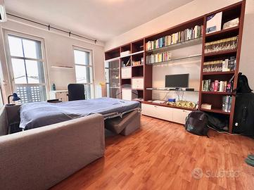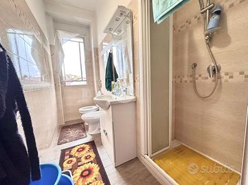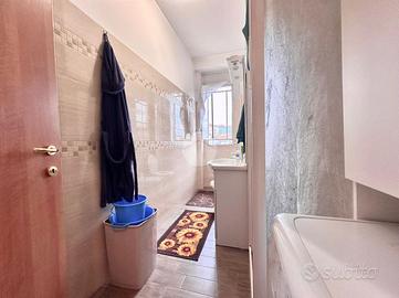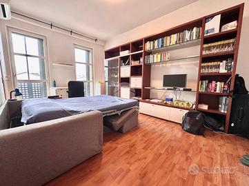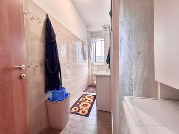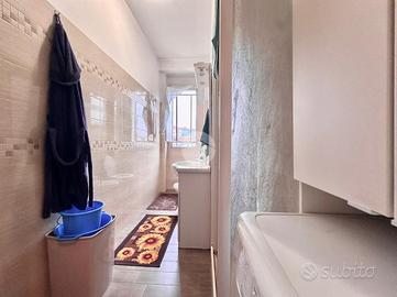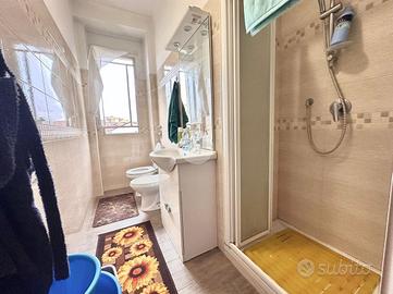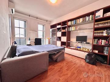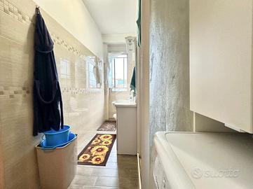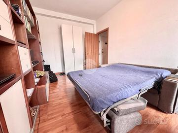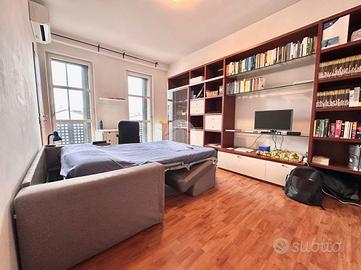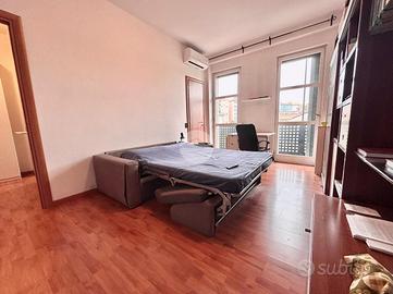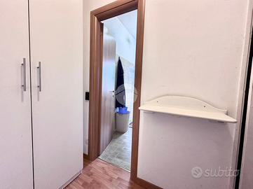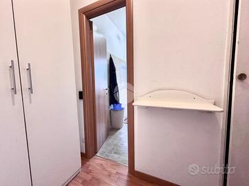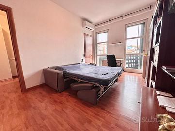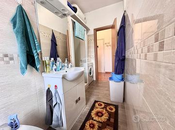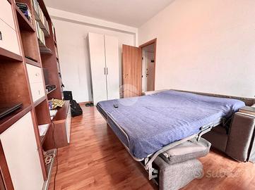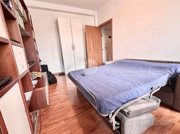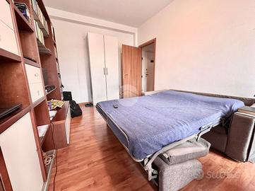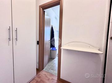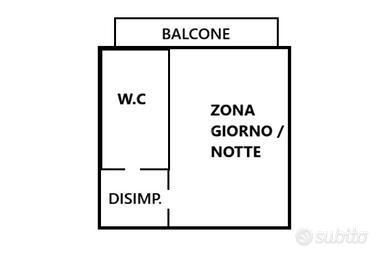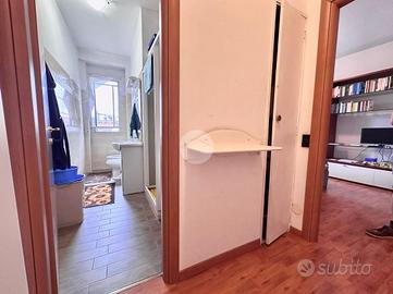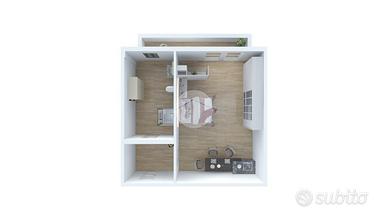 Ingresso in disimpegno dal quale accediamo ai vari ambienti della casa. Subito sulla destra abbiamo accesso alla zona giorno/notte, con cucina a vista e dalla quale abbiamo accesso tramite doppia portafinestra al balcone vivibile con affaccio tranquillo sulla corte interna. Infine, con medesimo affaccio, il bagno finestrato, con box doccia.