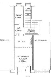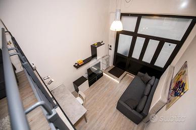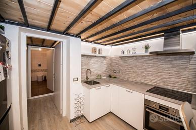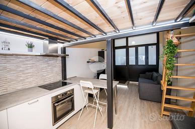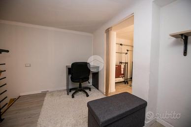 Composto di zona giorno con angolo cottura e bagno finestrato al piano di sotto e zona notte con scrivaria e cabina armadio.
