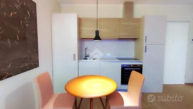 L'ingresso conduce direttamente nella zona giorno/notte, un ambiente elegante e funzionale composto da un'ampia zona living con cucina a vista e divano letto, con accesso diretto all'ampio terrazzo, perfetto per momenti di relax o convivialità all'aperto. Completa la soluzione un bagno moderno con box doccia.