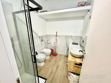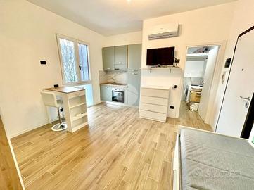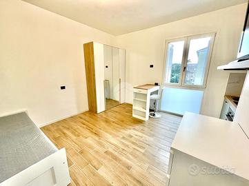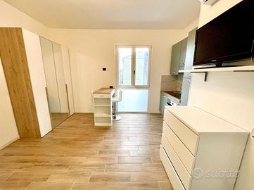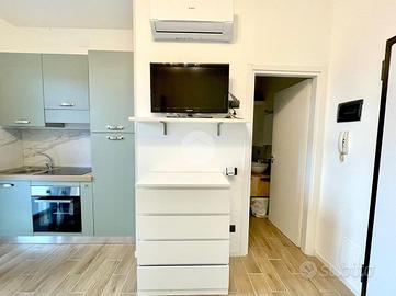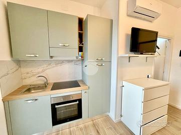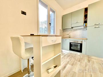 L'appartamento è composto da un unico ambiente principale luminoso, con cucina a vista moderna e funzionale, dotata di piano cottura ad induzione, forno e spazio per la zona pranzo. La zona giorno/notte è arredata con divano letto e armadiatura su misura.