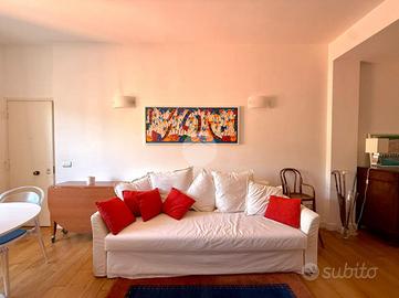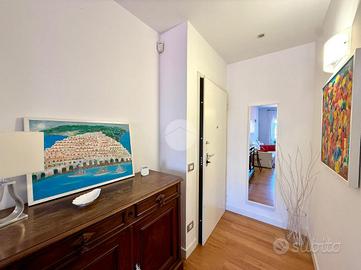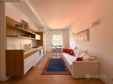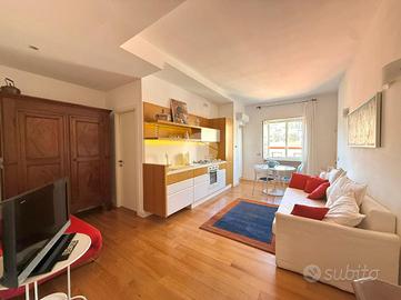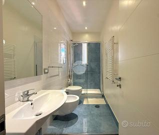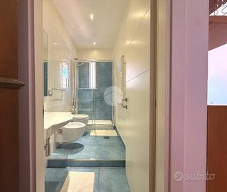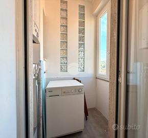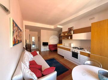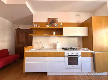 Accesso in open space illuminato da un'ampia finestra con esposizione libera, arredato con due divani letto, angolo cottura completo di elettrodomestici quali frigo e forno, bagno finestrato completo di igienici sospesi, box doccia e vano lavanderia annesso.