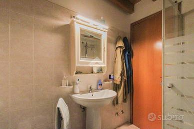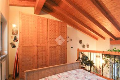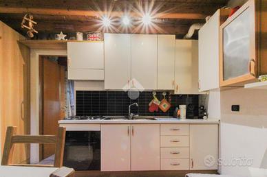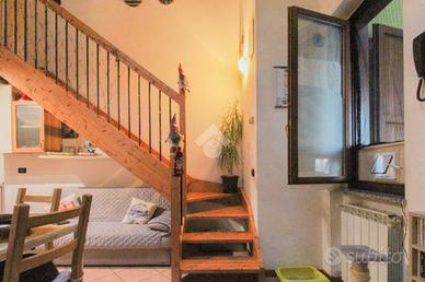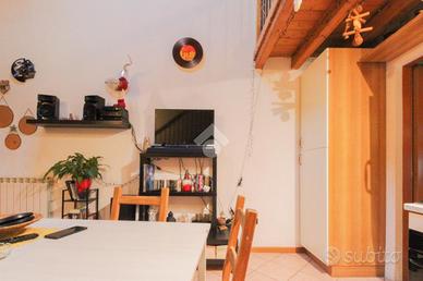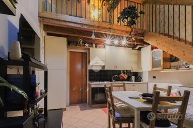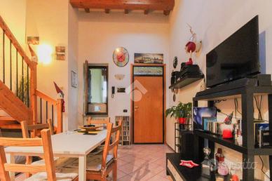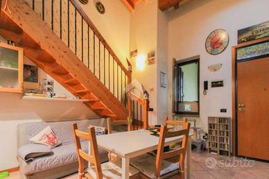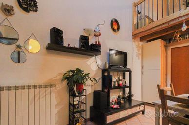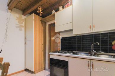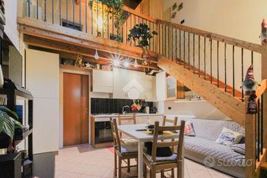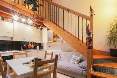 L'ingresso si apre su una zona giorno con cucina open space, seguita da un pratico disimpegno e un bagno finestrato dotato di doccia. Una scala a vista conduce alla zona notte soppalcata, dove si trova una camera matrimoniale.
