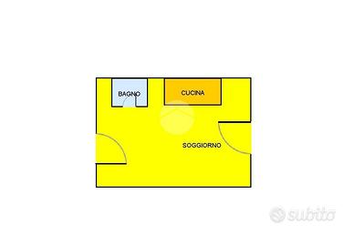 La soluzione è così disposta: entrando troviamo una zona giorno open-space con due divani letto, un cucinotto e un bagno con doccia.