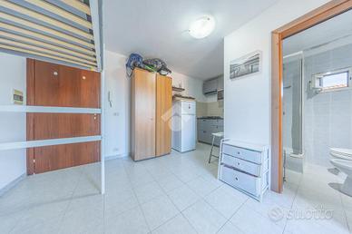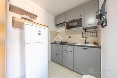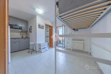 L'appartamento, è stato organizzato in modo pratico e funzionale: l'ingresso accoglie in una zona adibia con letto a castello che permette di mantenere spazio utile per un'eventuale scrivania o tavolo; proseguendo troviamo una zona adibita ad angolo cottura ben disposto e un locale adibito a bagno con finestra.